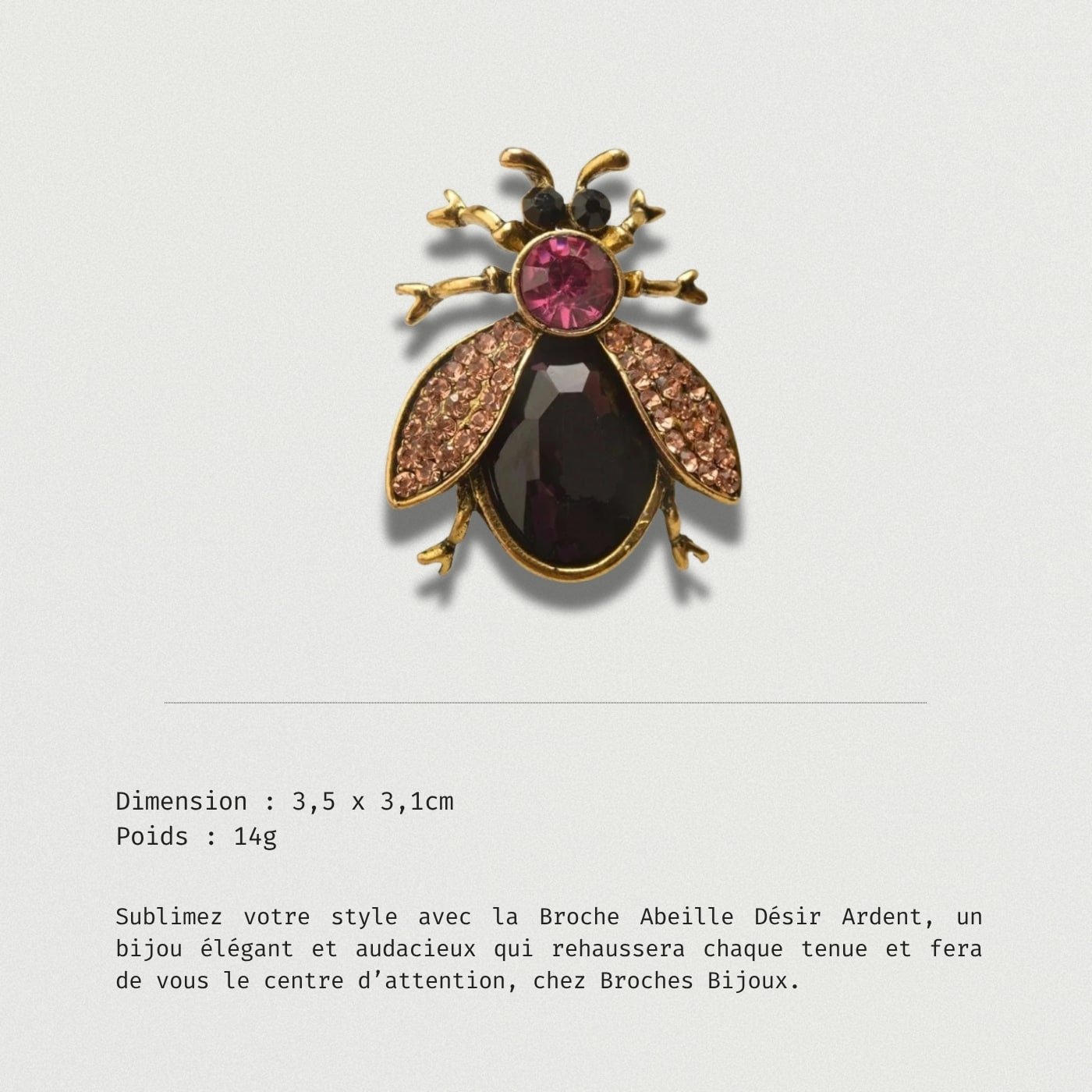 Découvrez la Broche Abeille Désir Ardent, l’accessoire qui sublimera votre style avec élégance et audace à chaque occasion. Ce bijou raffiné, alliant sophistication et originalité, est conçu pour attirer les regards et transformer vos tenues. Affirmez votre personnalité et laissez transparaître votre goût pour la mode en ajoutant cette pièce incontournable à votre collection.