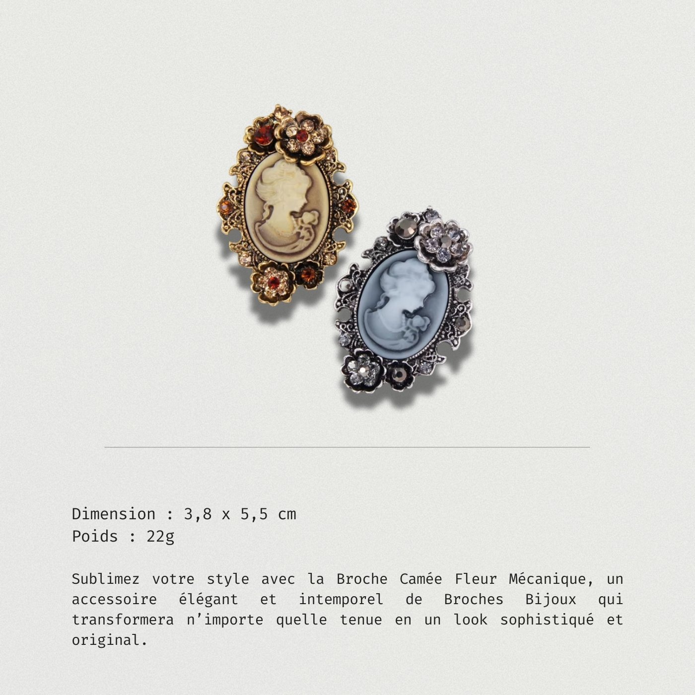 Apportez une touche d’élégance à votre style avec la Broche Camée Fleur Mécanique, un accessoire qui sublime toutes vos tenues dans toutes les occasions.
