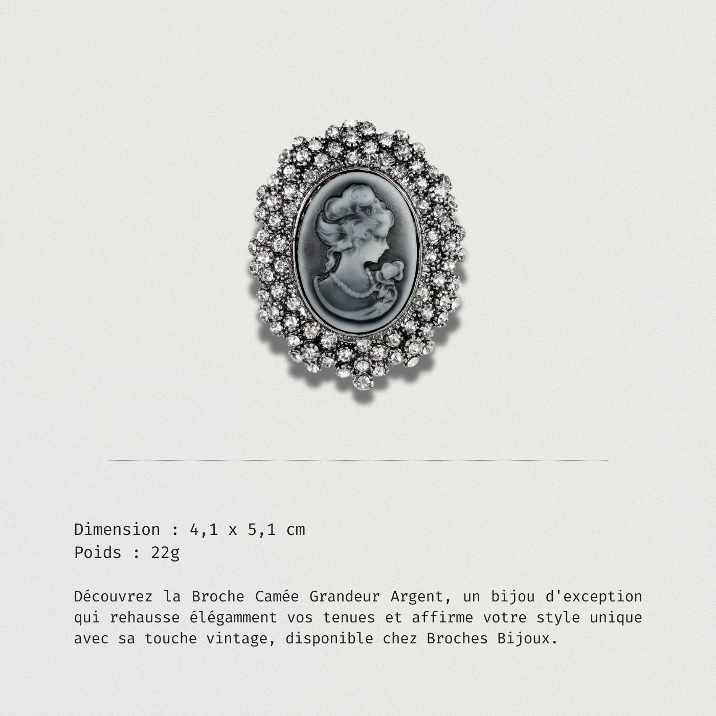Ajoutez une touche de distinction à vos tenues avec la Broche Camée Grandeur Argent, un bijou qui allie charme vintage et élégance.
