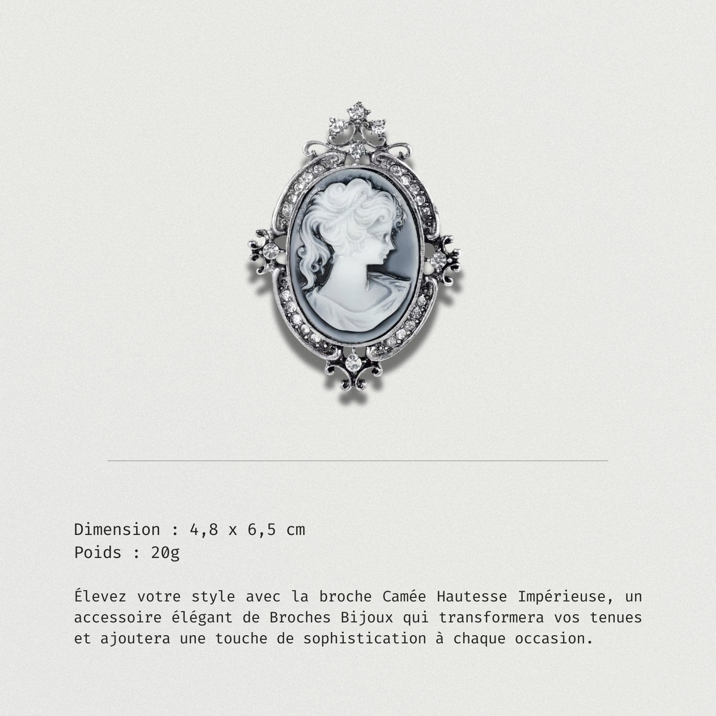 Découvrez Broche Camée Hautesse Impérieuse, un bijou qui apporte une note raffinée à votre garde-robe. Idéale pour agrémenter vos tenues, elle s’intègre facilement dans divers styles.