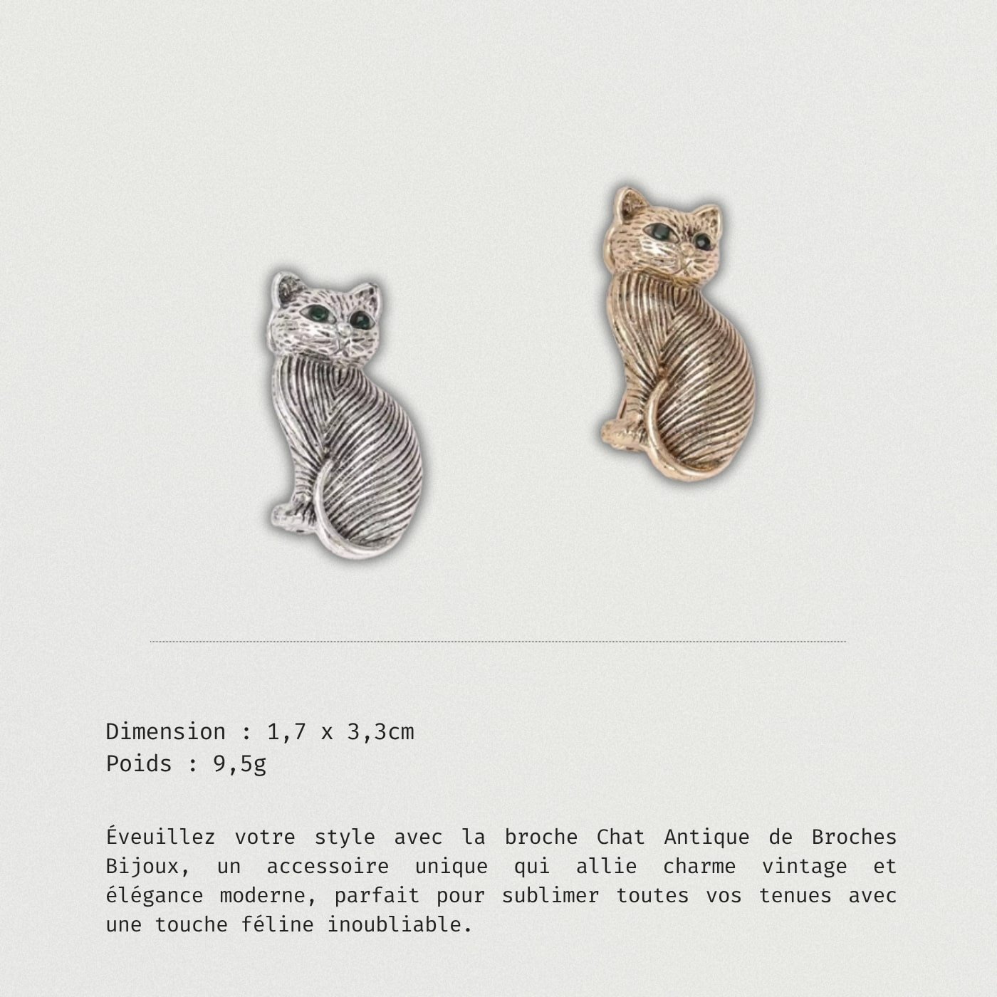 Éveuillez votre style avec la broche Chat Antique de Broches Bijoux, un accessoire unique qui allie charme vintage et élégance moderne, parfait pour sublimer toutes vos tenues avec une touche féline inoubliable.