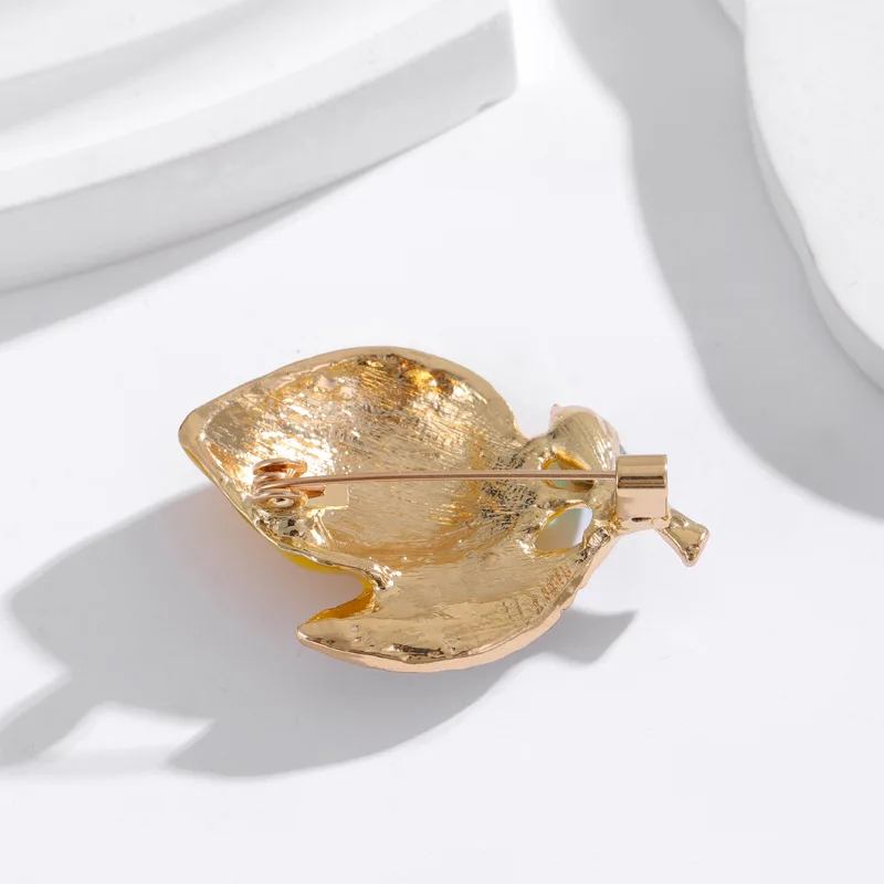 Cette broche se distingue par son allure élégante et son design inspiré du citron. Avec ses détails en strass, elle attire l’attention tout en ajoutant une note stylée à vos accessoires.