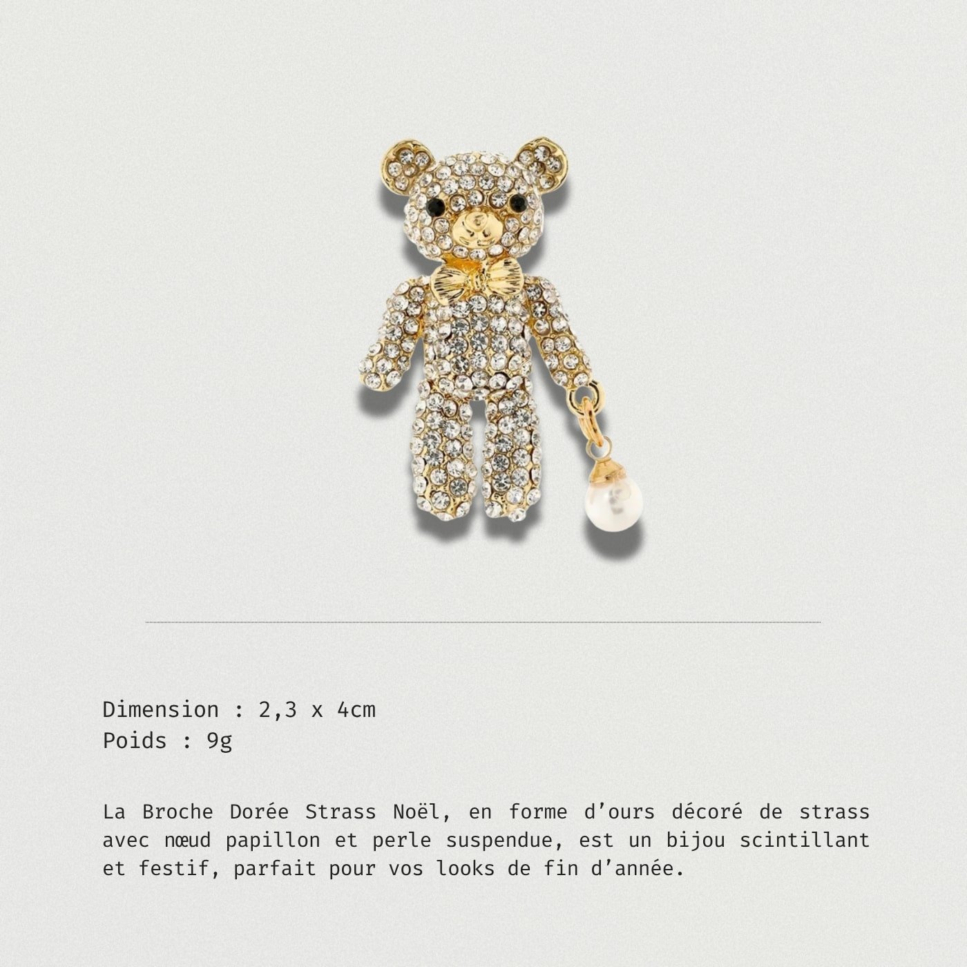 La Broche Dorée Strass Noël, en forme d’ours décoré de strass avec nœud papillon et perle suspendue, est un bijou scintillant et festif, parfait pour vos looks de fin d’année.