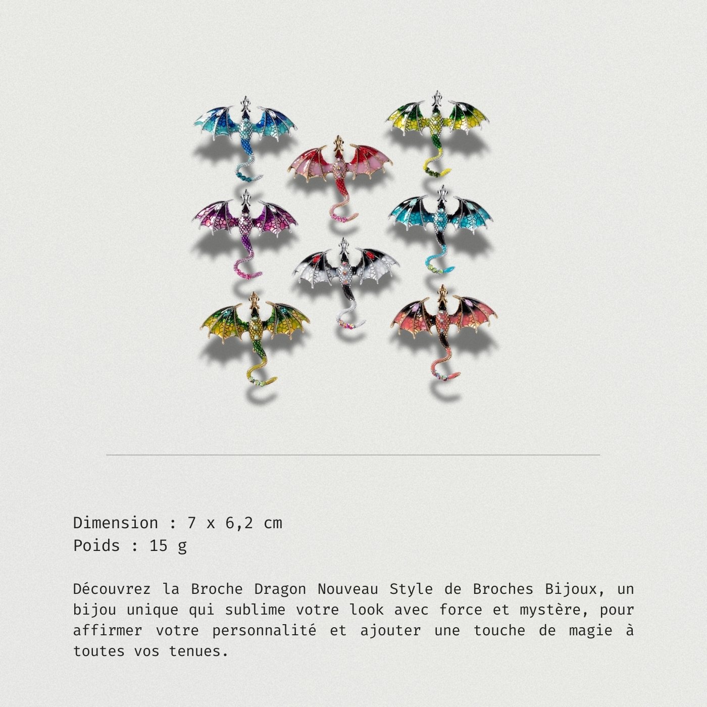 Idéale pour enrichir votre collection, la Broche Dragon Nouveau Style est parfaite pour toute occasion, que ce soit un événement spécial ou une tenue quotidienne.