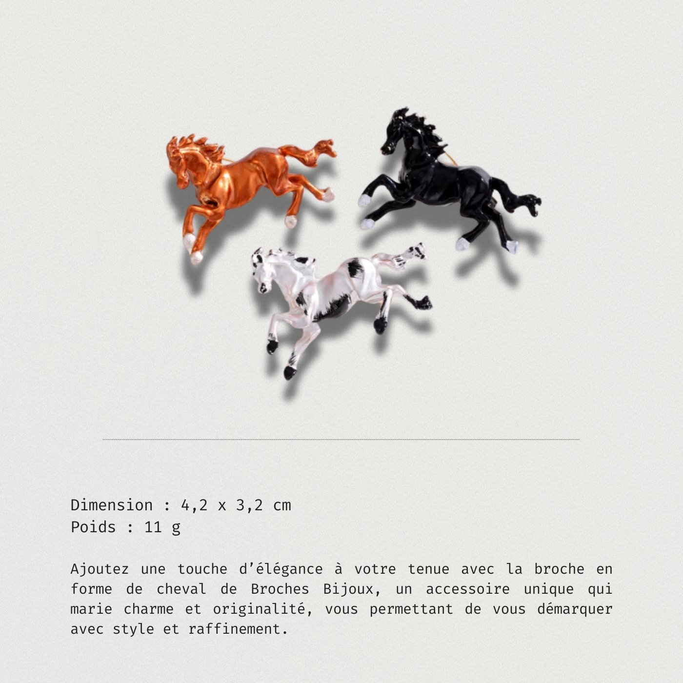 Découvrez Broche En Forme De Cheval, un bijou unique qui apporte une touche d’élégance à votre garde-robe. Avec son design original, elle attire les regards et raconte une histoire. Parfaite pour toute occasion, cette broche rehaussera n’importe quelle tenue.