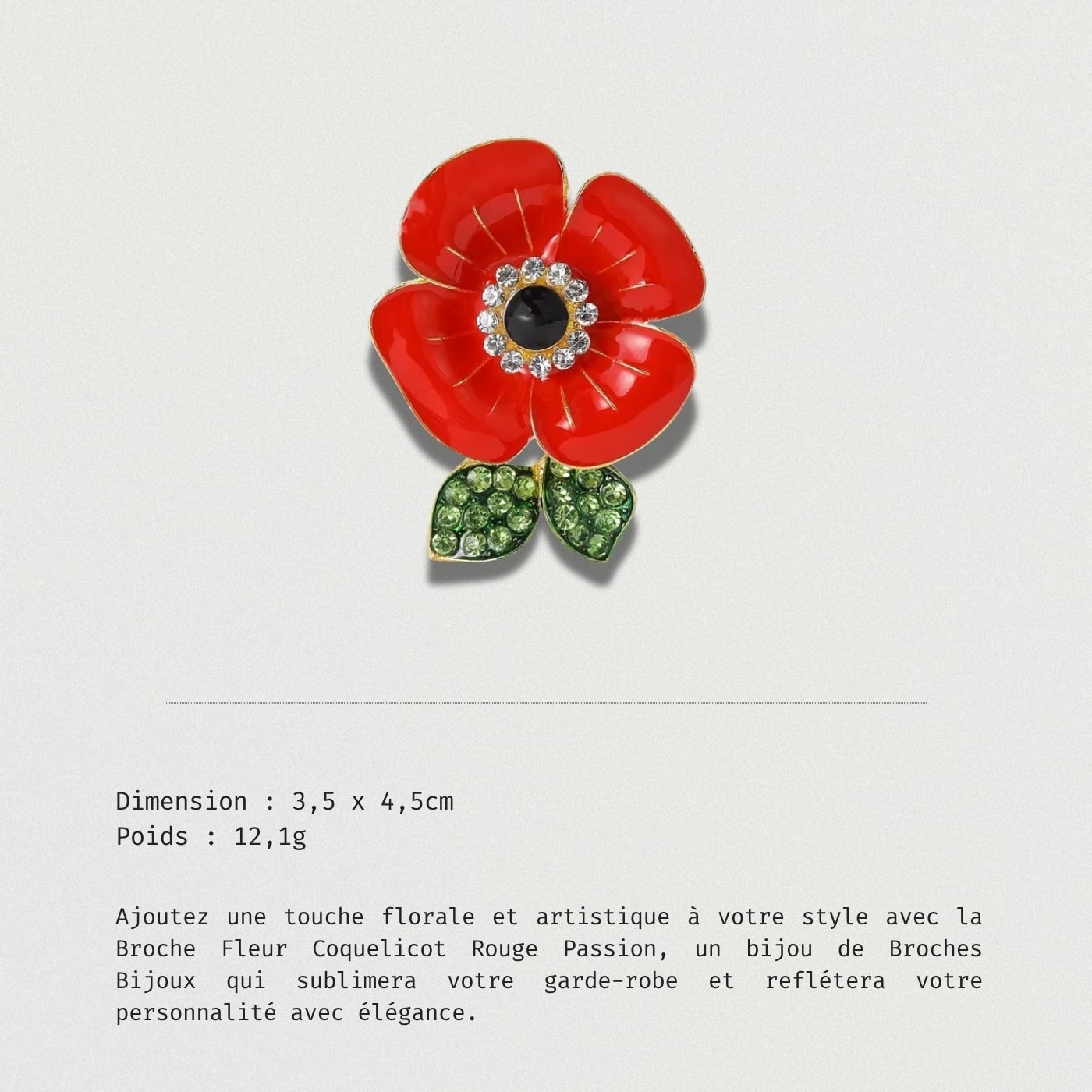Le coquelicot, symbole de passion et de délicatesse, donne à cette broche une dimension émotionnelle unique. Porter la Broche Coquelicot Rouge Passion, c’est afficher un style audacieux tout en cultivant la finesse et le romantisme. Chaque détail a été pensé pour refléter un savoir-faire de qualité.