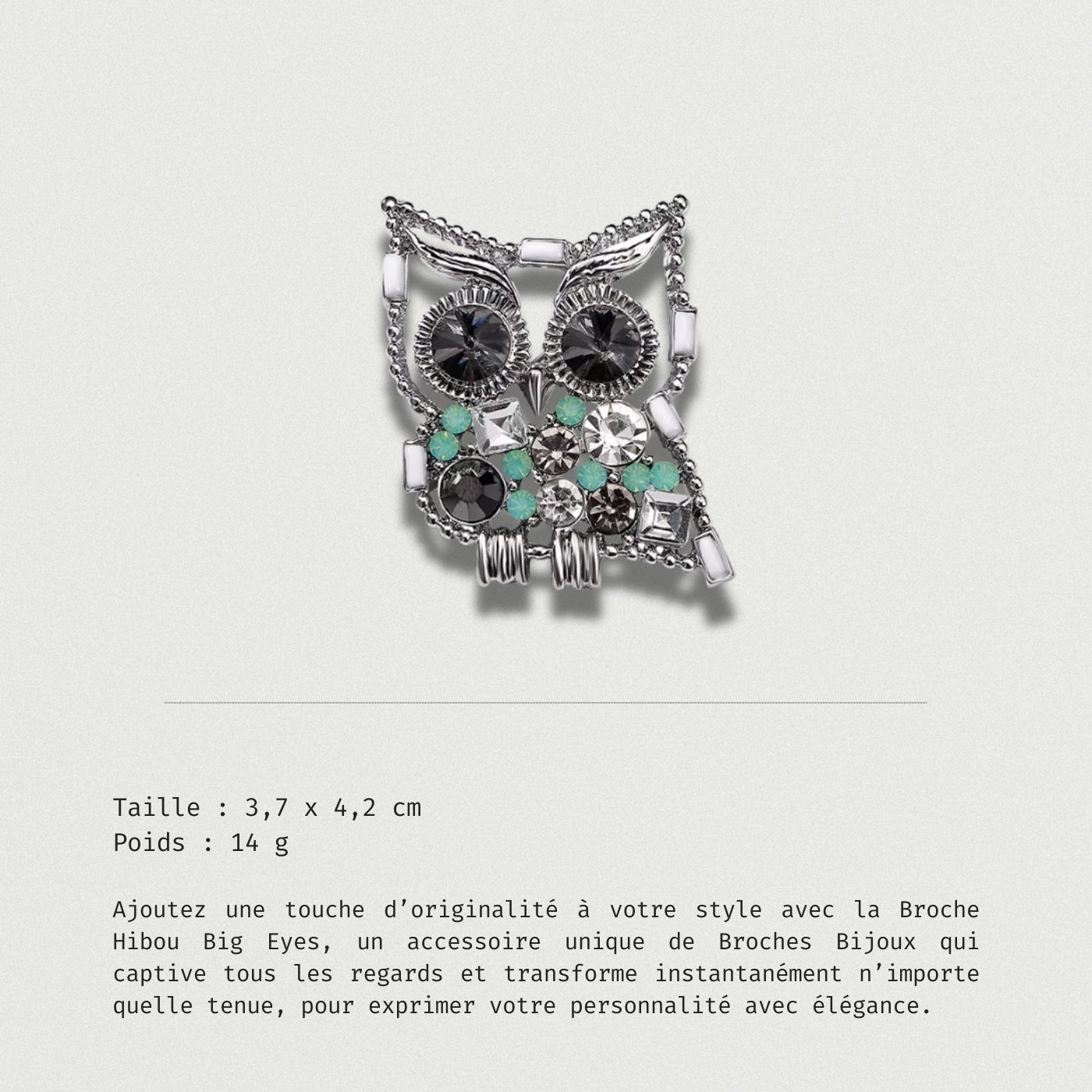 Découvrez Broche Hibou Big Eyes, un bijou au design captivant qui attire tous les regards. Avec son regard expressif et son style original, cette broche est l’accessoire parfait pour ajouter une touche de fantaisie à votre tenue.