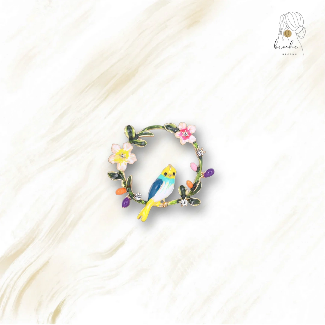 Broche Oiseau Dans Sa Couronne De Fleurs