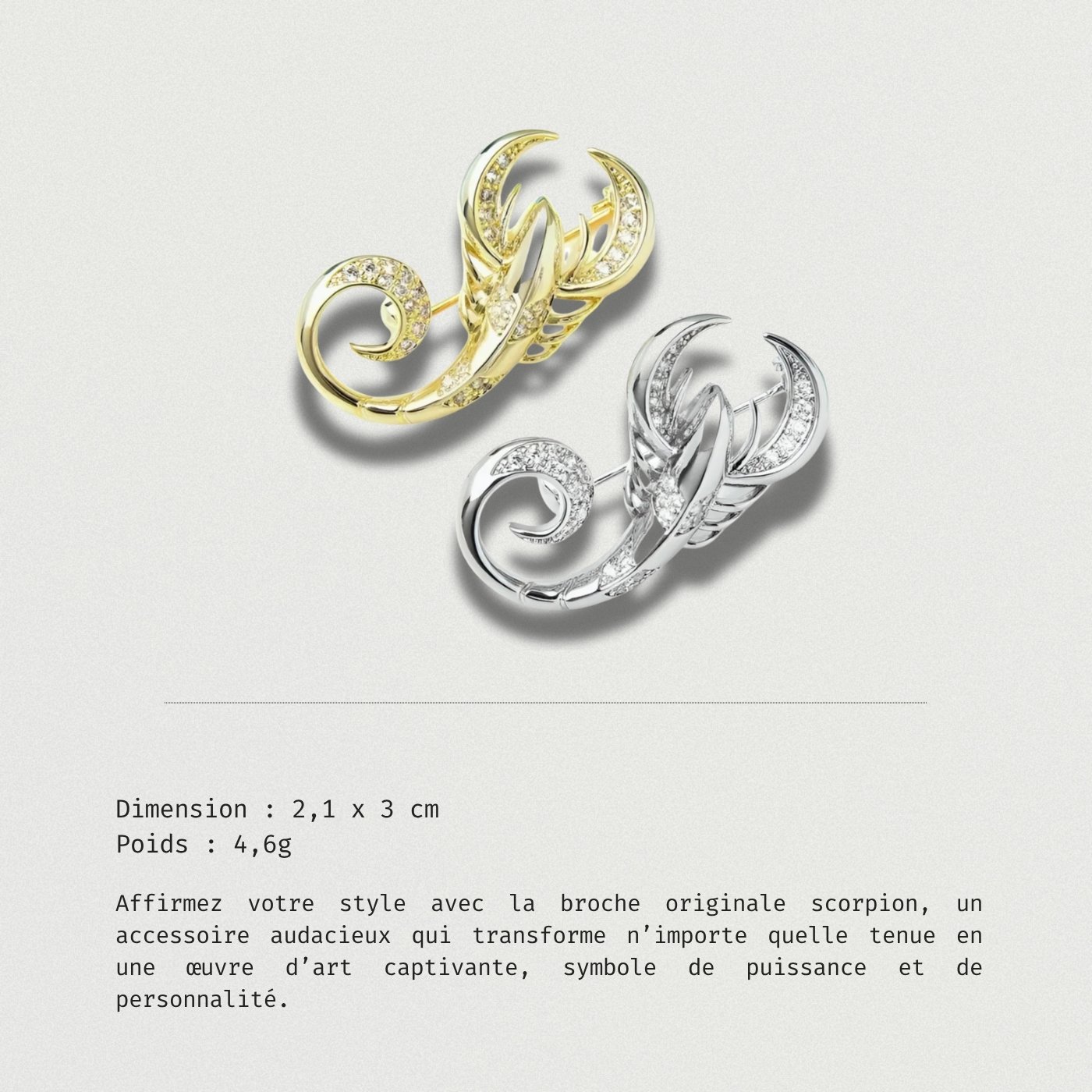 La broche scorpion incarne force et élégance, faisant d’elle un accessoire de mode à la fois symbolique et raffiné. Elle apporte un style affirmé à vos tenues, tout en révélant votre personnalité.