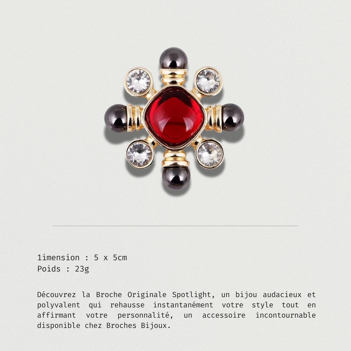 Découvrez la Broche Originale Spotlight, un bijou audacieux qui rehaussera instantanément votre style. Avec son design unique et son savoir-faire artisanal, cette pièce séduisante est conçue pour attirer tous les regards tout en affirmant votre personnalité. Polyvalente et élégante, elle s’adapte parfaitement à toutes vos tenues, que ce soit pour une soirée habillée ou une journée décontractée. Laissez-vous séduire par cet accessoire incontournable qui illuminera votre collection de bijoux !