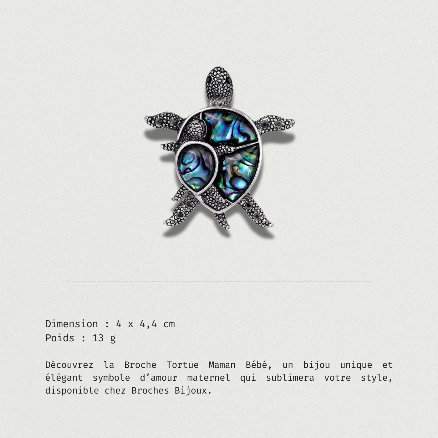 La Broche Tortue Maman Bébé est un bijou élégant symbolisant l’amour familial, parfait pour toute occasion. Un accessoire qui complète vos tenues avec délicatesse.