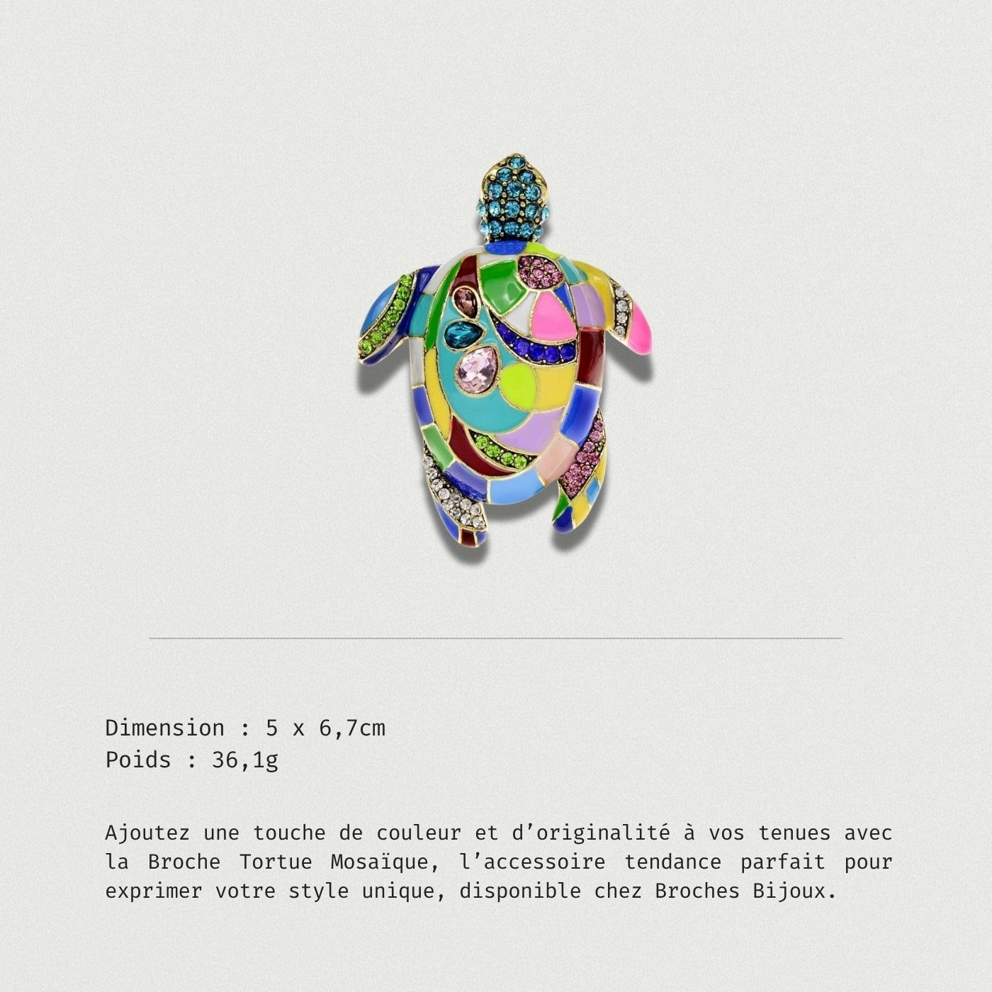Ajoutez une touche de couleur et d’originalité à vos tenues avec la Broche Tortue Mosaïque, l’accessoire tendance parfait pour exprimer votre style unique, disponible chez Broches Bijoux.
